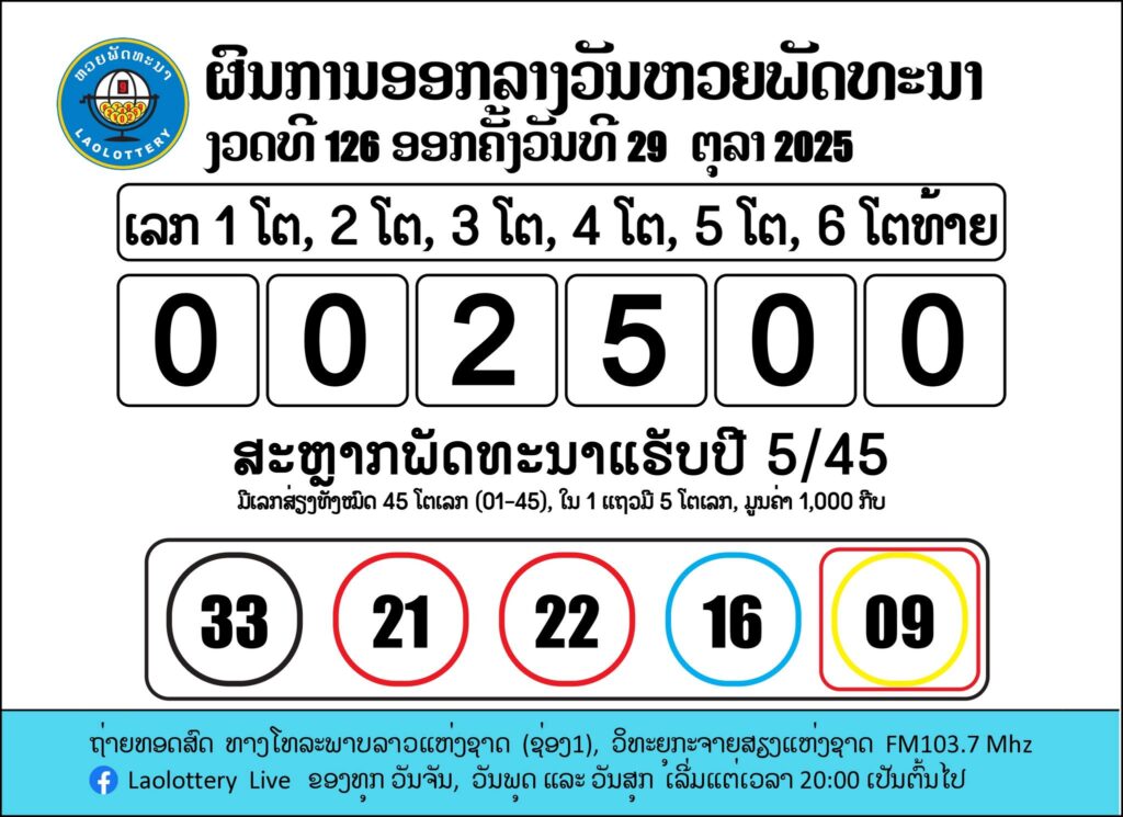 📌 ผลรางวัลหวยลาววันนี้ 29 ตุลาคม 2568 (ลาวพัฒนา)