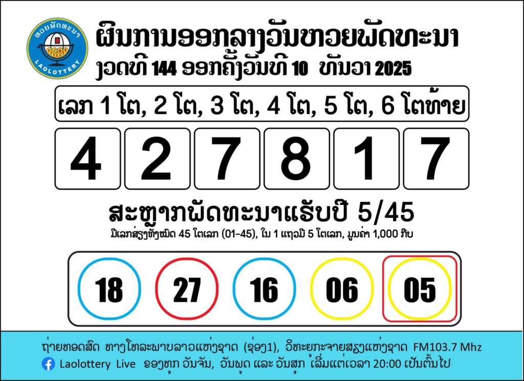 📌 ผลรางวัลหวยลาววันนี้ 10 ธันวาคม 2568 (ลาวพัฒนา)