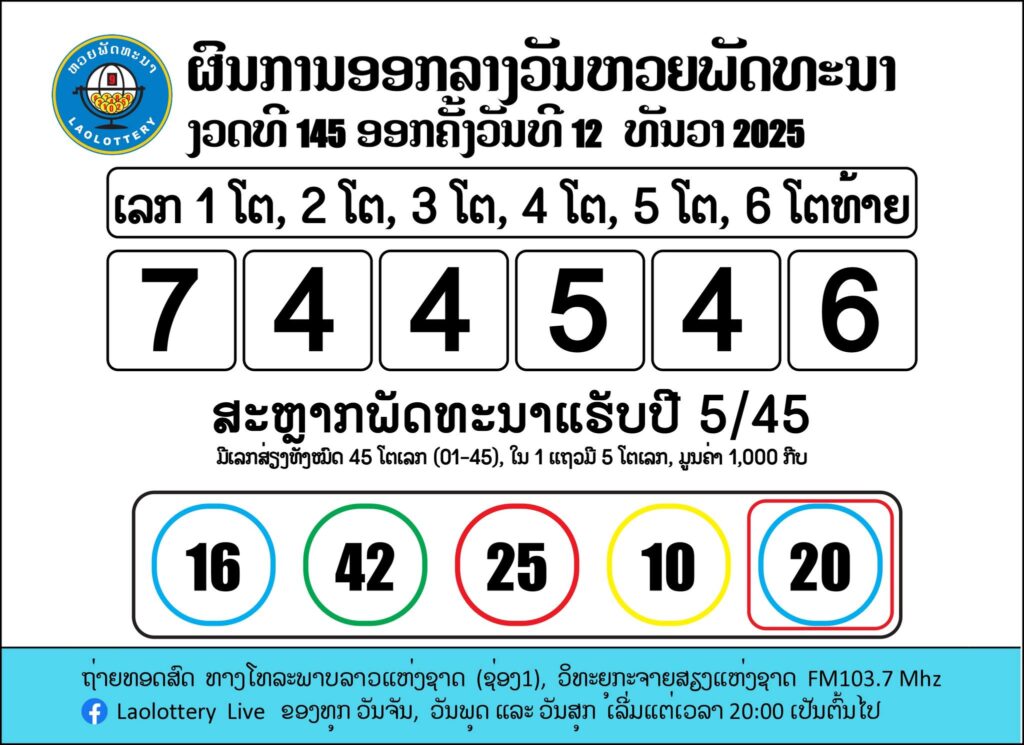 งวดวันที่ 12 ธันวาคม 2568 หวยลาวพัฒนาออกเลข 6 ตัว 744546 ตามด้วยรางวัล 5 ตัว 44546, 4 ตัว 4546, 3 ตัว 546, 2 ตัว 46 และเลขท้าย 1 ตัว 6 ขณะที่สลากพัฒนา 5/45 ออกเลขชุด 16, 42, 25, 10, 20 ภาพรวมงวดนี้ถือว่าเลขกลุ่ม 4–6 เด่นมาก โดยเฉพาะเลข 4 ที่โผล่ซ้ำหลายตำแหน่งในชุดรางวัลใหญ่ ทำให้โทนตัวเลขวันนี้แกว่งอยู่ในโซน 0–4–6 อย่างชัดเจน เหมาะสำหรับใช้ดูเป็นแนวทางเชิงสถิติประกอบการวิเคราะห์งวดต่อไป