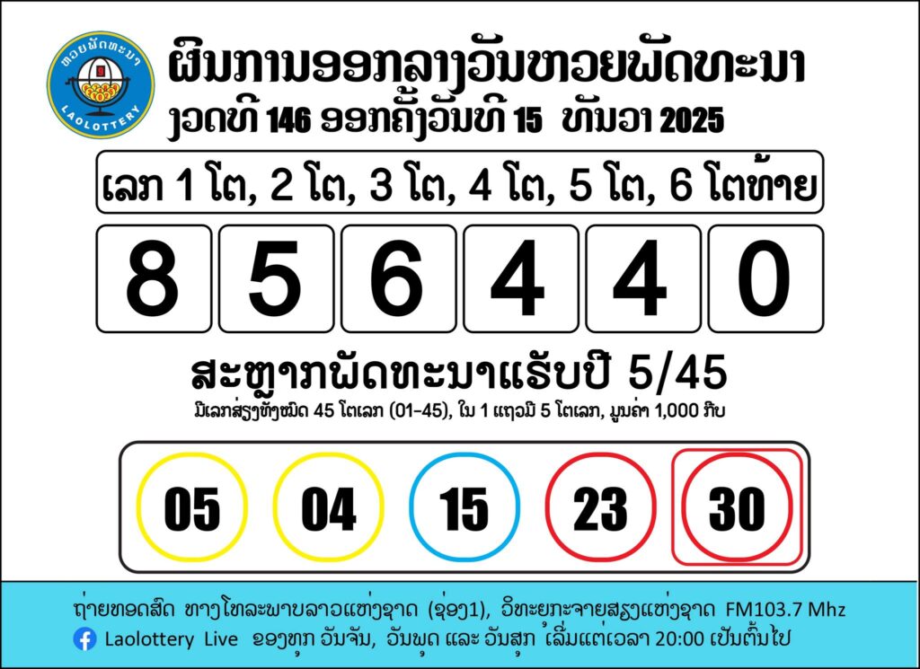 📌 ผลรางวัลหวยลาววันนี้ 15 ธันวาคม 2568 (ลาวพัฒนา)