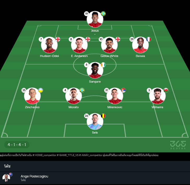ผู้ตัดสินเกมนี้คือ Willy Delajod สถิติเสี้ยงใบเหลืองปานกลาง ฝั่งฟอเรสต์มีแข้งเดี้ยงหลายราย ทั้ง Douglas Luiz, Ola Aina, Murillo รวมถึงเพลย์เมคเกอร์ James McAtee ที่เจ็บรบกวน จึงต้องพึ่งแกนหลักอย่างกิ๊บบ์ส-ไวท์และซ็องกาเร่คุมจังหวะกลางสนาม คาดยึดแผน 4-1-4-1 เติมแบ็กซ้าย ซินเชนโก้ สอดสร้างสรรค์เกม