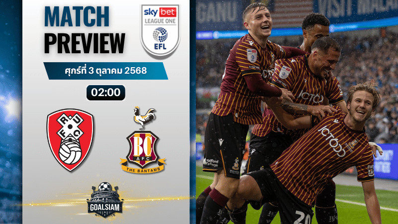 คู่นี้เดือดจริงแบบบอลอังกฤษขนานแท้ เจ้าบ้าน ร็อตเธอร์แฮม ยูไนเต็ด กำลังหาทางเบรกสถิติพ่าย 3 นัดรวด ส่วนผู้มาเยือน แบรดฟอร์ด ซิตี้ ฟอร์มขึ้นหม้อ มั่นใจเต็มถังหลังยืนฝั่งบนของตาราง จังหวะนี้เหมาะสุดสำหรับสายลุ้น วิเคราะห์บอล GOALSIAM เพราะรูปเกมเปิดหน้าแลก มีมุมให้เล่นทั้งราคาและสกอร์รวม
