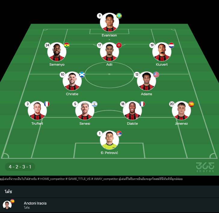 อันโดนี่ อิราโอล่า ยังคงมีปัญหาผู้เล่นบาดเจ็บบางราย โดยเฉพาะ อดัม สมิธ, เอเนส อูนัล ที่ยังเจ็บอยู่ ขณะที่ ลูอิส คุ๊ก ยังต้องเช็กฟิต ส่วนตัวหลักคนอื่นพร้อมลุยเต็มที่ ระบบที่ใช้ยังคงเป็น 4-2-3-1 เน้นครองบอลกลางสนามและสวนกลับเร็ว