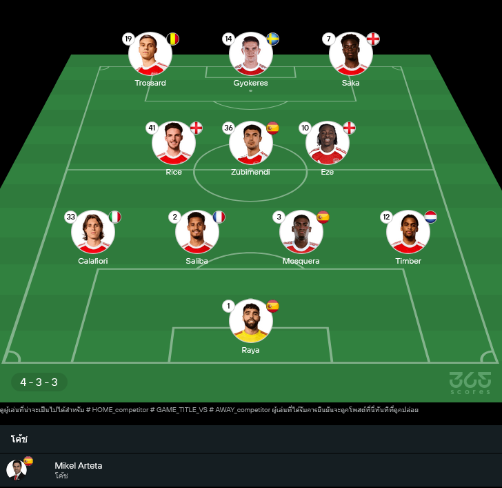 ลูกทีมของ มิเกล อาร์เตต้า ยังคงเจ็บยาวหลายราย ทั้ง กาเบรียล เฮซุส, ไค ฮาแวร์ตซ์, และ โนนี่ มาดูเอเก้ รวมถึงต้องเช็คฟิต ฮินคาปิเอ้ แต่โดยรวมแล้วยังมีขุมกำลังแน่น แผนที่คาดคือ 4-3-3 เดินเกมบุกเต็มสูบด้วยความมั่นใจ