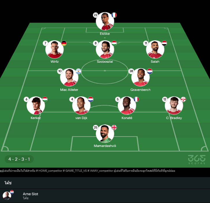 ฝั่ง “หงส์แดง” ของ อาร์เน่ สล็อต สภาพดีกว่า แม้จะไม่มี อลิสซง, เอคิติเก้ และ เลโอนี่ ที่เจ็บอยู่ แต่ตัวหลักยังครบ โดยใช้แผน 4-2-3-1 เช่นกัน มี ซาล่าห์, ซโบสไล, เวิร์ตซ์ ปั้นเกมหลังหัวหอกตัวเป้า