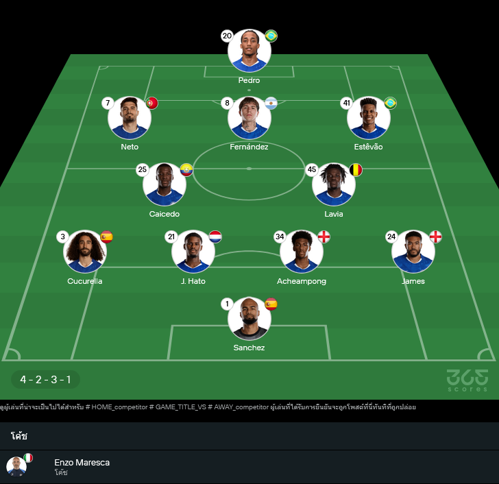 กุนซือ เอนโซ่ มาเรสก้า ปวดหัวสุด ๆ เพราะมีผู้เล่นบาดเจ็บยาวเป็นหางว่าว ทั้ง โคล พัลเมอร์, ลาเวีย, โฟฟาน่า, โคลวิลล์, มัดดริก, สเตอร์ลิ่ง, และ ดีแล็ป ยังไม่พร้อมทั้งหมด ทำให้ต้องพึ่งแข้งหนุ่มหลายราย