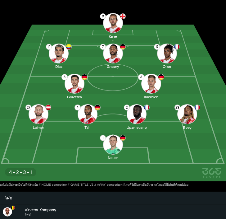 วินเซนต์ กอมปานีหมุนทรัพยากรแบบพอดี แต่โครงสร้างหลักยังแน่น ตัวเจ็บมียาวได้แก่ โยซิป สตานิชิช, โยนาส อูร์บิก, จามาล มูเซียลา, อัลฟอนโซ่ เดวี่ส์ ขณะที่ ฮิโรกิ อิโตะ ต้องเช็คฟิต ระบบยืนพื้น 4-2-3-1 ความน่ากลัวอยู่ที่เกมรุกชุดใหญ่ไฟกระพริบ นำโดย แฮร์รี่ เคน