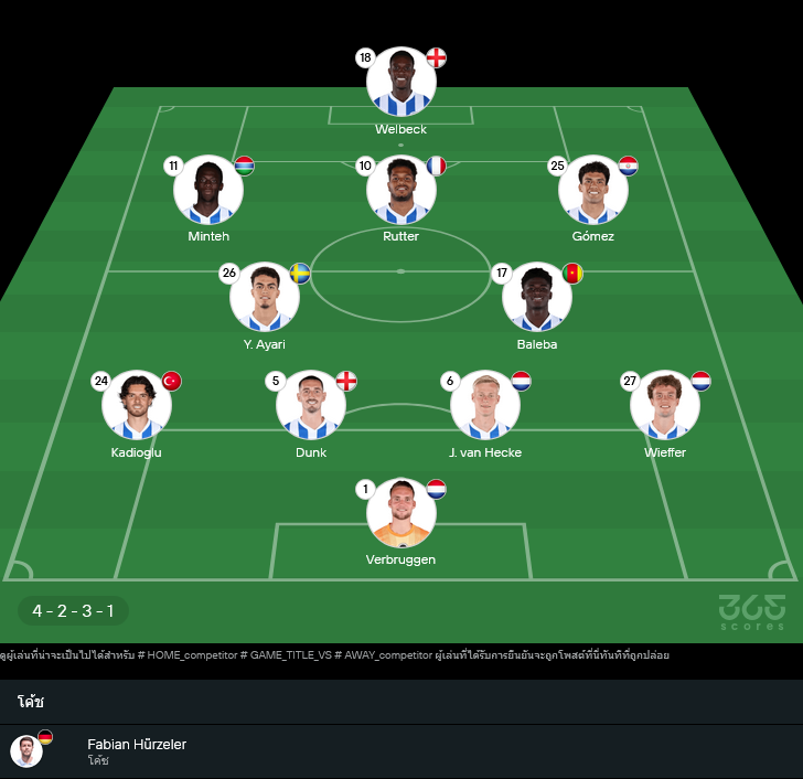 ฟาเบียน ฮูร์เซเลอร์ มีลิสต์เจ็บยาวพอตัว ทั้ง Jack Hinshelwood, Adam Webster, Solly March, Joël Veltman ส่วน คาโอรุ มิโตมะ ต้องเช็กฟิต แต่โครงสร้างทีมยังเดินหน้าได้เต็มสูบด้วยทรง 4-2-3-1 เกมกลางรับใช้ Baleba ยืนบู๊คู่ Y. Ayari ปล่อยสามตัวรุก Minteh, Rutter, Gómez ป้อนบอลให้ Danny Welbeck ที่กำลังมั่นใจจากผลงานล่าสุด