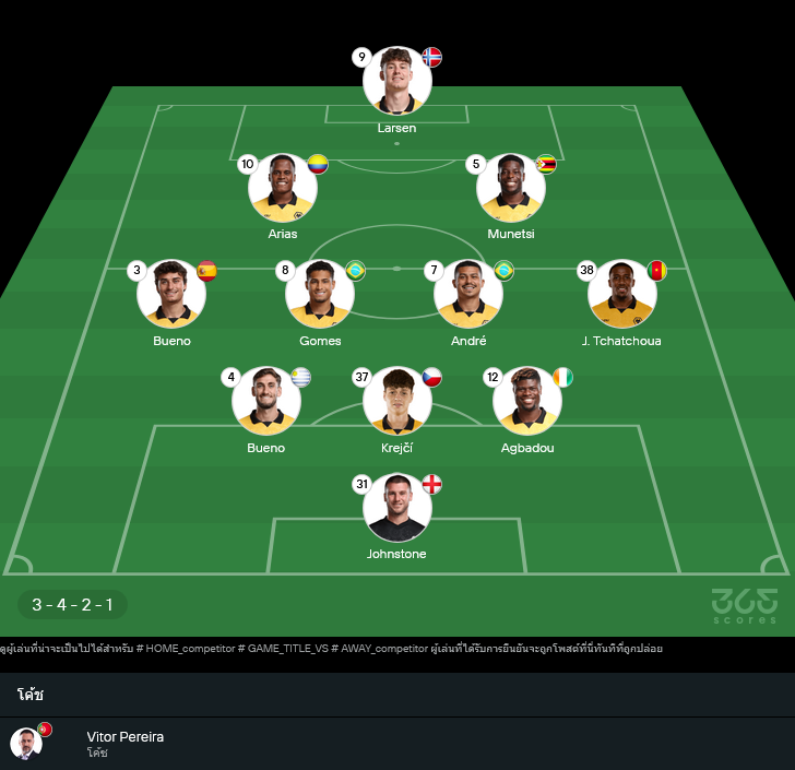 อัพเดตจากภาพชุดข้อมูลล่าสุด วูล์ฟส์ของวิตอร์ เปไรร่า ไม่มีโทษแบนเพิ่ม ตัวเดี้ยงยืนยันคือ ลีออน ชิโวม ส่วนแกนหลักที่เหลือพร้อมลุย ระบบเดิม 3-4-2-1 เล่นวินัยโซนรับแน่นแล้วรอสวนเร็วทางวิงแบ็กขวาอย่าง จู๊ด ตชัตโชวา และการเคลื่อนที่ของ อาริอาส หน้าเป้าใช้ ยอร์เก้น สแตรนด์ ลาร์เซ่น คอยปักคานรอบอลครอสและลูกชิ่งในกรอบจุดโทษ ซึ่งหากแดนกลางคุมจังหวะได้ เกมจะไหลลื่นขึ้นเยอะสำหรับเจ้าบ้านในรูปแบบนี้