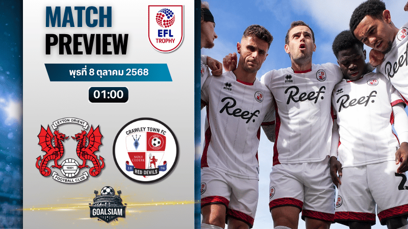 ศึกบอลถ้วย EFL Trophy หรือที่คอบอลบ้านเราคุ้นกันในชื่อ จอห์นสโตนส์ เพนท์โทรฟี่ กลับมาลงสนามอีกครั้ง! คราวนี้เป็นคิวของ เลย์ตัน โอเรียนท์ จากลีกวัน ที่เตรียมเปิดรัง “เกาแกน กรุ๊ป สเตเดี้ยม” ต้อนรับการมาเยือนของ ครอว์ลีย์ ทาวน์ ทีมแกร่งจากลีกทู คืนวันที่ 8 ตุลาคม 2568 เวลา 01:00 น. คู่นี้น่าสนใจสุด ๆ เพราะทั้งสองทีมต่างต้องการเรียกความมั่นใจหลังผลงานสะดุดยาว ฝั่งเจ้าบ้านข่มในสถิติการพบกัน แต่ทีมเยือนก็พร้อมบวก! งานนี้ วิเคราะห์บอล GOALSIAM ขอบอกเลยว่าห้ามพลาด!