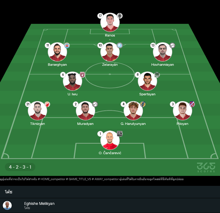 ทีมเยือนของ เยกิเช เมลิคยาน ไม่มีชื่อ เอ็ดการ์ เซวิกยาน ที่บาดเจ็บ แต่ยังจัดชุดใหญ่นำโดย เซลารายาน, สเปียร์ซยาน และ รานอส พร้อมเปิดเกมบุกสู้เต็มสูบ