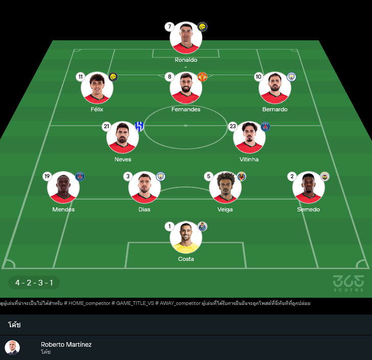 🇵🇹 โปรตุเกส (แผน 4-2-3-1) – โค้ช: Roberto Martínez
