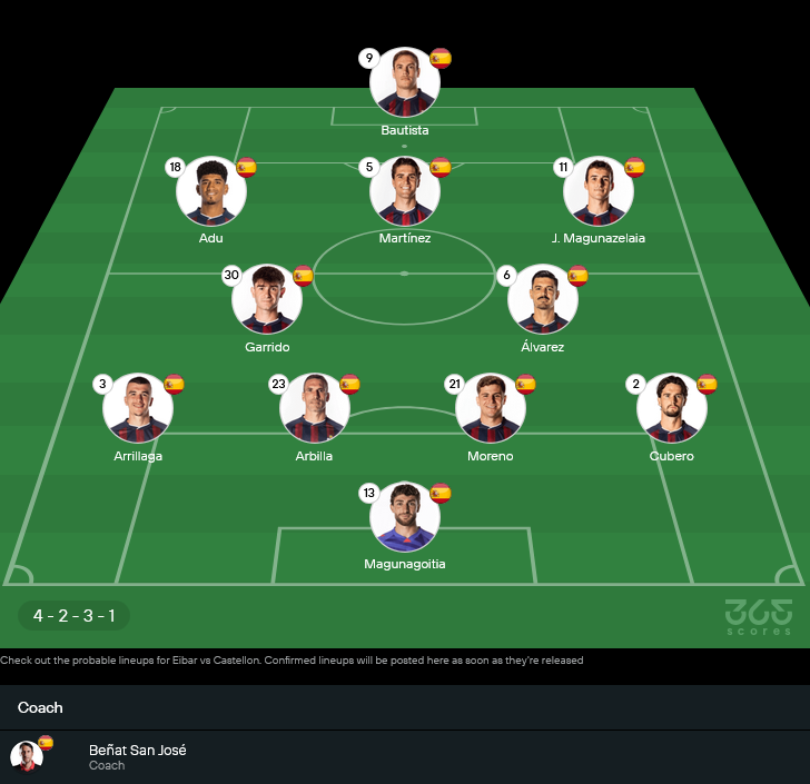 โค้ช เบญาต ซาน โฆเซ่ ต้องขาด เลโอนาร์โด้ บูต้า แบ็กซ้ายตัวหลักที่โดนแบนจากเกมก่อน แต่ยังดีที่ตัวหลักรายอื่นอยู่ครบ คาดว่าทีมจะจัดทัพระบบ 4-2-3-1 นำโดยหัวหอกตัวเก่ง ฆอน เบาติสต้า ส่วนแนวรุกจะเป็น โฆเซ่ กอร์ปาส, อาดู อาเรส และ มาร์ติเนซ ปั้นเกมอยู่ด้านหลัง