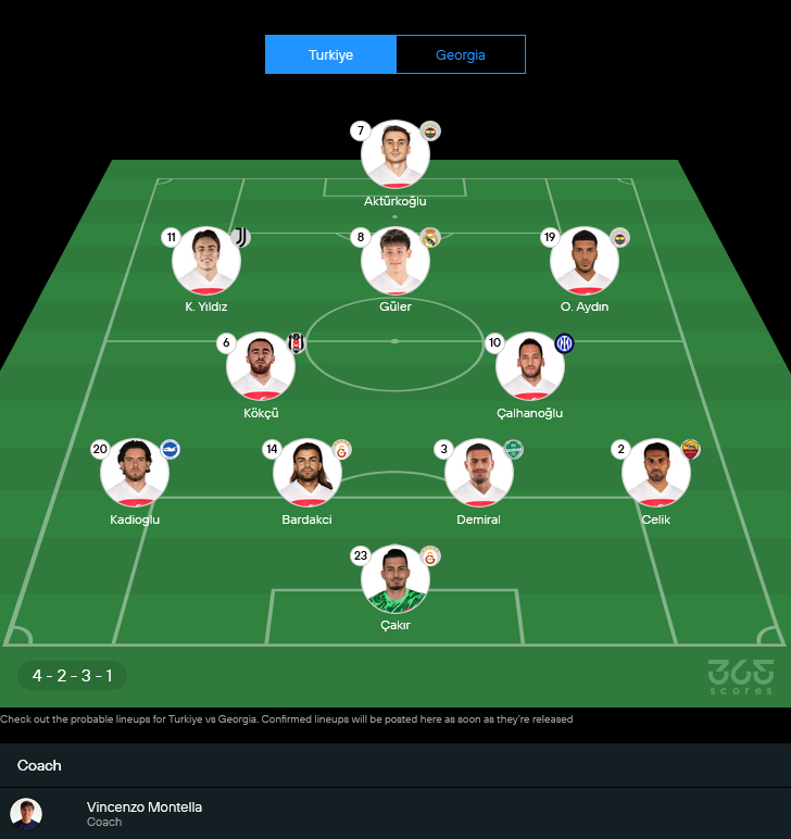 ขุมกำลังพร้อมลุยต่อเนื่องจากเกมถล่มบัลแกเรีย ตัวเจ็บที่หายไปก่อนหน้าได้แก่ Demir Ege Tiknaz, Mustafa Eskihellaç และ Kaan Ayhan แต่แกนหลักพร้อมจัดหนัก แผน 4-2-3-1 ของ วินเชนโซ่ มอนเตลล่า เดินเกมรุกด้วยความไวและแม่นยำ