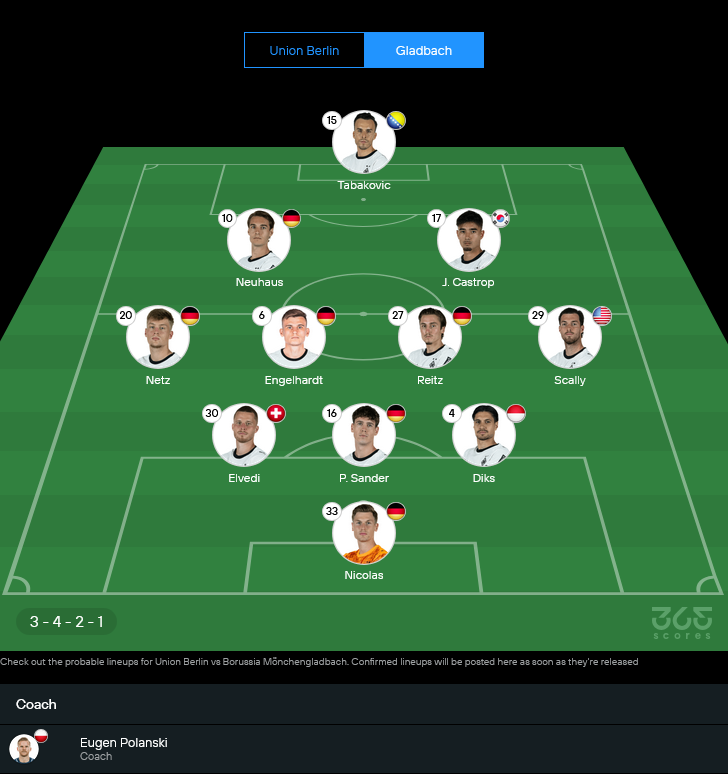 สภาพทีมขาดตัวดังหลายราย จากภาพอัปเดตเจ็บมี Robin Hack, Nathan N’Goumou, Tim Kleindienst, Fabio Chiarodia ส่วน Giovanni Reyna สถานะก้ำกึ่ง ไลน์อัพคาด 3-4-2-1 หลังสามยืนลึก รอเปลี่ยนสปีดสวนด้วยปีกวัยสด
