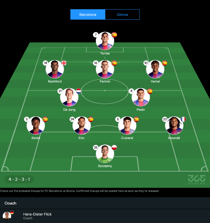 ปัญหาตัวเจ็บเยอะพอตัว รายชื่อที่พักยาวมี Marc-André ter Stegen, Gavi, Dani Olmo, Raphinha, Robert Lewandowski, Ferran Torres รวมถึง Joan García แต่ขุมกำลังหลักอย่าง Pedri และ Frenkie de Jong ยังพร้อมเดินเครื่อง เกมนี้ ฮันซี ฟลิค มีแนวโน้มใช้ 4-2-3-1 เน้นครองบอลบี้ริมเส้นด้วย ลามีน ยามาล และใส่ความเร็วของ มาร์คัส แรชฟอร์ด ด้านหน้าเป้าคาดว่า เฟร์ราน ตอร์เรส ยืนค้ำ
