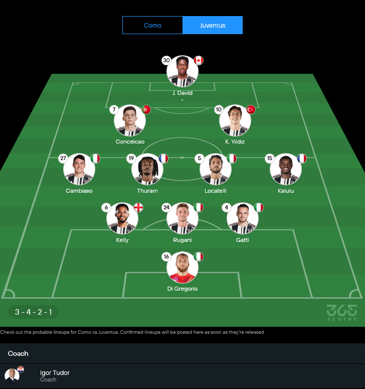 อีกอร์ ทูดอร์ ยังไร้ เบรเมร์ ที่ผ่าหัวเข่า, พินโซโญ และ มิลิค ส่วน ฟาบิโอ มิเร็ตติ ต้องเช็กฟิต แท็กติก 3-4-2-1 ใช้ วิงแบ็กเติมกว้าง สร้างพื้นที่ให้สองกลางรุก เคนาน ยิลดิซ กับ ฟรานซิสโก้ คอนไซเซา ป้อนให้หอก โจนาธาน เดวิด