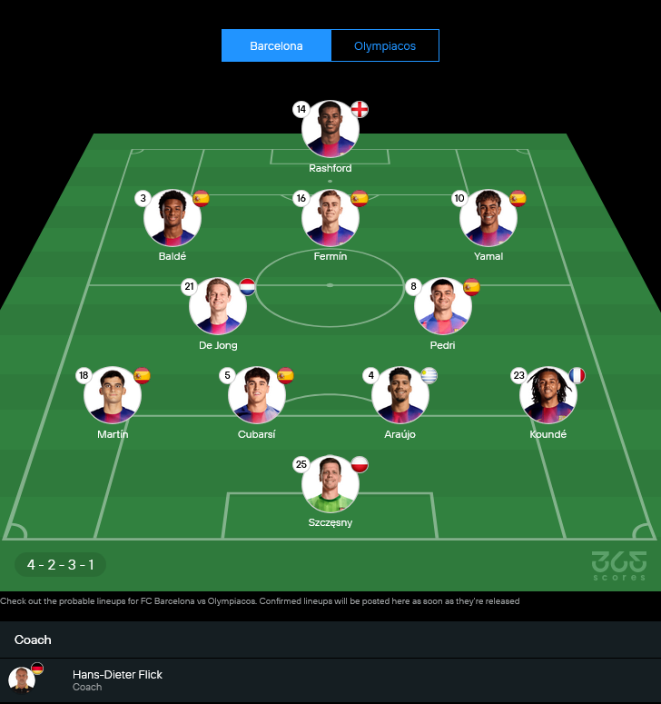 ลูกทีมของ ฮานส์-ดีเทอร์ ฟลิค มีปัญหาผู้เล่นบาดเจ็บอย่าง เลวานดอฟสกี้, ราฟินญ่า, แตร์ สเตเก้น, กาวี และ ดานี่ โอลโม่ ที่ยังไม่พร้อมคืนสนาม แต่ยังมีขุมกำลังแน่นปึ้ก นำโดย รัชฟอร์ด ในแดนหน้า และสามตัวรุก ยามาล, เฟร์มิน, บัลเด้ พร้อมสร้างความป่วนแนวรับคู่แข่ง