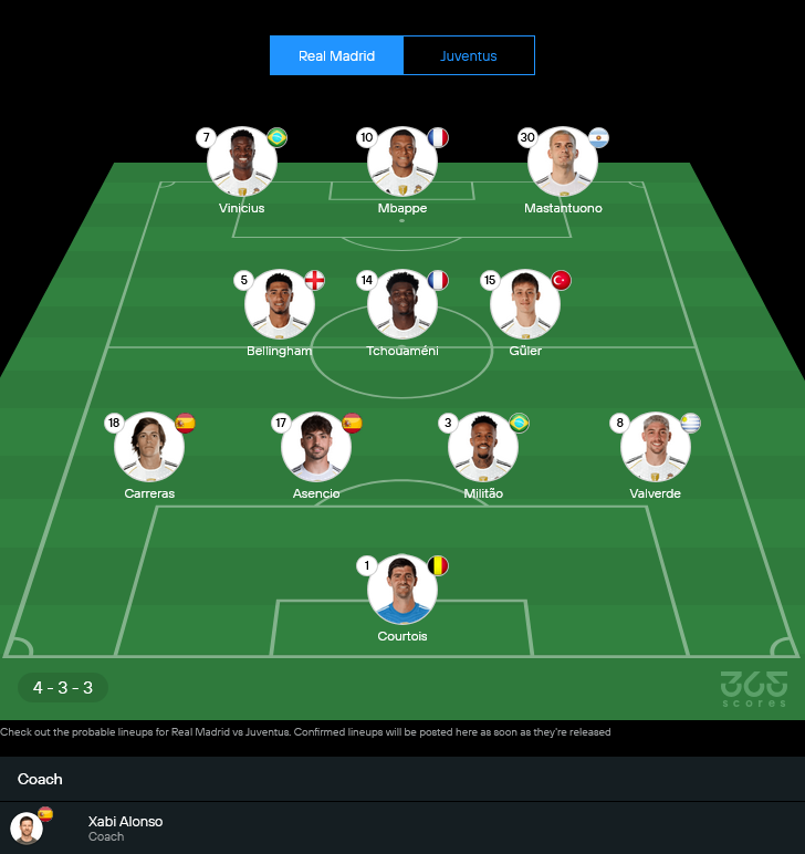 อลอนโซ่ยังต้องปวดหัวกับอาการบาดเจ็บของ รูดิเกอร์, เทรนต์, เซบายอส, เมนดี้ และการขาด การ์บาฆาล ที่ติดโทษแบน แถม อลาบา กับ ฮุยเซ่น ยังต้องเช็กความฟิต แต่แกนหลักยังอยู่กันครบ โดยเฉพาะแนวรุกระดับโลกอย่าง เอ็มบัปเป้, วินิซิอุส และ เบลลิงแฮม ที่พร้อมไล่บดคู่แข่งตั้งแต่นาทีแรก
