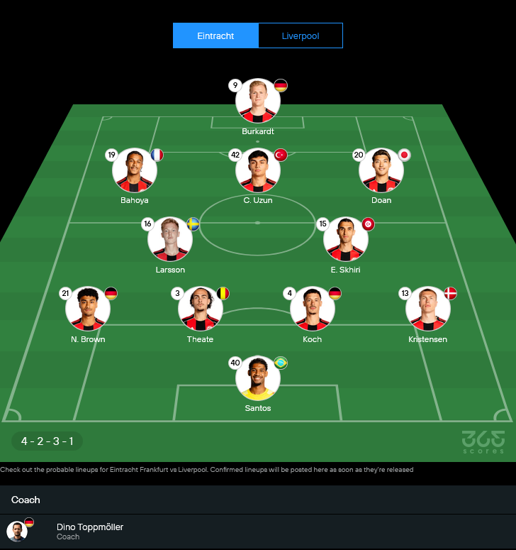 แม้จะไม่เคยเจอกันมาก่อน แต่หากมองจากสไตล์การเล่น แฟร้งค์เฟิร์ต ชอบเปิดเกมบุกสู้เต็มพิกัด ขณะที่ ลิเวอร์พูล ภายใต้การคุมทีมของ อาร์เน่ สลอต มักเล่นเกมรุกเร็วและบี้คู่แข่งตั้งแต่ต้น นาทีต่อนาทีจึงคาดว่าจะเข้มข้นแบบไม่มีช่วงให้หายใจ