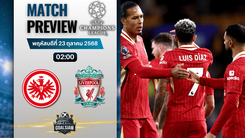 คืนวันพฤหัสบดีที่ 23 ตุลาคม 2568 แฟนบอลทั้งโลกเตรียมระเบิดความมันส์ เมื่อ ไอน์ทรัค แฟร้งค์เฟิร์ต ต้องเปิดบ้านดวลเดือดกับ ลิเวอร์พูล ยอดทีมแห่งเกาะอังกฤษในศึก ยูฟ่าแชมเปียนส์ลีก เกมนี้บอกเลยว่าไม่ธรรมดา เพราะทั้งสองทีมต่างอยู่ในช่วงฟอร์มเป๋ และต้องการชัยชนะเพื่อเรียกความมั่นใจกลับมาแบบสุดๆ ใครที่ตามสาย วิเคราะห์บอล GOALSIAM ห้ามกระพริบตาเด็ดขาด เพราะแมตช์นี้มีแต่คำว่า “บวกหรือบวก” เท่านั้น