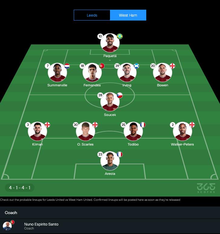 - ผู้เล่นคาดว่าจะลงสนาม: อาเรโอล่า (6.8), วอล์คเกอร์-ปีเตอร์ส (6.7), โตดิโบ (6.8), สการ์ลส์ (6.7), คิลแมน (6.8), ซูเซ็ค (7.0), โบเว่น (7.2), ปาเกต้า (7.1), เฟอร์นันเดส (6.8), ซัมเมอร์วิลล์ (6.9), เพเกต้า (7.0)