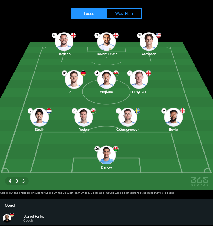 - ผู้เล่นคาดว่าจะลงสนาม: ดาร์โลว์ (6.9), โบเกิ้ล (6.8), โรดอน (6.9), สเตราย์ค (6.8), กุ๊ดมุนด์สสัน (6.7), แอมปาดู (6.9), สตัค (7.0), ลองสตาฟฟ์ (6.8), อารอนสัน (7.1), คัลเวิร์ต-เลวิน (7.0), แฮร์ริสัน (7.2)
