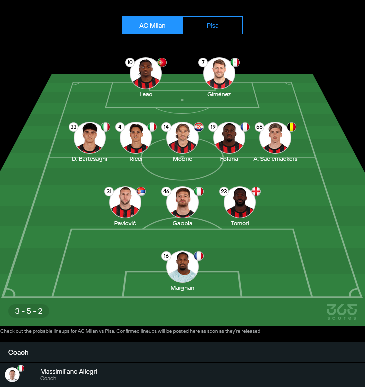 แม็กซ์ อัลเลกรีหมุนทรัพยากรได้โหด แม้ขาดยาวหลายรายทั้ง คริสเตียน พูลิซิช, อาเดรียง ราบิโอต์, เปร์วิส เอสตูปิญาน, อาร์ดอน ยาชารี และ รูเบน ลอฟตัส-ชีค ส่วน คริสโตเฟอร์ เอ็นคุนคู ฟิตกลับมาแล้วแต่คาดว่าสตาร์ตม้านั่ง แท็คติกเด่น 3-5-2 เน้นครองบอลไล่เพรสสูงและฉีกริมเส้นแล้วตัดเข้าใน