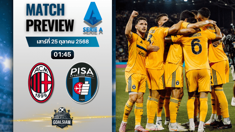 ค่ำคืนนี้เตรียมมันส์ไฟลุก เมื่อ เอซี มิลาน จ่าฝูงฟอร์มแรง เปิดบ้านรับทีมบ๊วย ปิซ่า เกมที่ทั้งแท็คติกและแรงจูงใจชัดเจน เจ้าถิ่นต้องการสามแต้มยืดระยะนำ ส่วนทีมเยือนมาแพ็คเกมรอจังหวะเผาเครื่อง ถ้าให้ GOALSIAM เล่าแบบเพื่อนคอบอลบอกกันตรงๆ โอกาสเห็นบอลบุกหนักฝั่งเดียวสูงมาก แต่มุมสวนมีให้ลุ้นเล็กๆ ตามสไตล์บอลรอง ศึกนี้เราจัดให้ครบทั้งข้อมูลและอินไซด์แน่นๆ ในโทน วิเคราะห์บอล GOALSIAM สายลุย