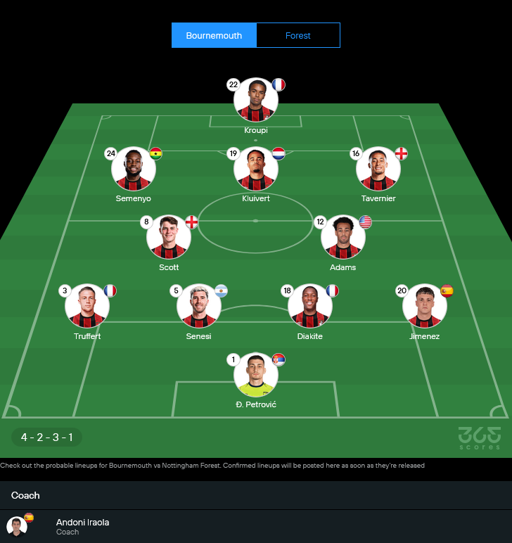อันโดนี่ อิราโอล่าเช็คฟิตยาวอย่าง เดวิด บรู๊คส์ และ เอเนส อูนัล ส่วน อีวานิลซอน ยังพักต่อ แต่ของใหม่มาแรงคือดาวยิงวัย 19 อย่าง อีไล ครูปี้ ที่กำลังมั่นใจหลังเบิ้ลเกมใหญ่ แดนกลางใช้คู่ผสมพลังหนุ่ม อเล็กซ์ สกอตต์ และ ไทเลอร์ อดัมส์ ปั้นเกมให้สามตัวรุก ไคลเวิร์ต ทาเวอร์เนียร์ เซม็องโย่