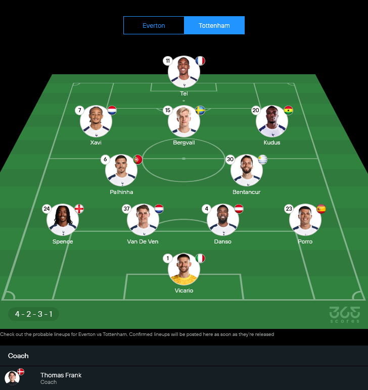 แฟรงค์เจอปัญหาตัวเจ็บกระจาย ทั้ง คูลูเซฟสกี้, แมดดิสัน, บิสซูม่า, เบน เดวีส์, ดรากูซิน แถม โรเมโร/อูโดกี/โอโดแบร์ บางรายยังต้องรอเช็กฟิต แต่ยังมีโครงกลางแน่นจาก เบนตานกูร์ กับ เปาลินญ่า เกมรุกฝากความหวังที่ คูดุส กับ ซาบี ซิม่อนส์ โดยมี ริชาร์ลิซอน ยืนหอก