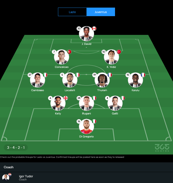 ฝั่งทีมเยือนม้าลายฟอร์มตกหนัก ตัวเจ็บยังเพียบทั้ง เบรเมร์, ฮวน กาบาล, อาร์คาดิอุสซ์ มิลิค และ คาร์โล ปินโซลิโอ ส่วนนักเตะที่มีชื่อสงสัยอย่าง เอดอน เชโกรว่า ยังต้องรอเช็กความฟิต แผน 3-4-2-1 พร้อมจัด โจนาธาน เดวิด ยืนเป็นหน้าเป้าคอยซัดประตู
