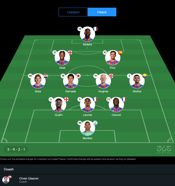 ลูกทีมของ โอลิเวอร์ กลาสเนอร์ ไม่มีรายงานตัวแบนเพิ่มเติม มีเพียง ชี๊ค ดูกูเร่, ชาดี้ ริอัด และ คาเล็บ คปอรา ที่ยังเจ็บ ส่วนกำลังหลักพร้อมจัดเต็มในระบบ 3-4-2-1 วาง มาเตต้า เป็นหอกตัวเป้า มี เอสเซ่ และ ปิโน่ ปั้นเกมอยู่ข้างหลัง เกมนี้อาจเล่นแบบตั้งรับเหนียวแน่นแล้วสวนกลับเร็ว