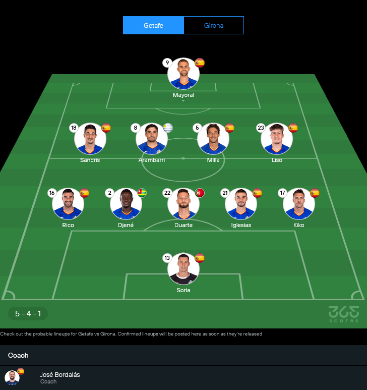 กุนซือ โฆเซ่ บอร์ดาลาส กลับมามีขวัญกำลังใจหลังบุกอัดบิลเบาได้ เกมนี้จะจัดทัพในระบบ 5-4-1 โดยมี บอร์ฆา มายอรัล ยืนหอกเดี่ยว ตัวเจ็บอย่าง Davinchi และ Abdelkadir Abqar ยังไม่พร้อม ส่วน Allan Nyom ติดโทษแบน