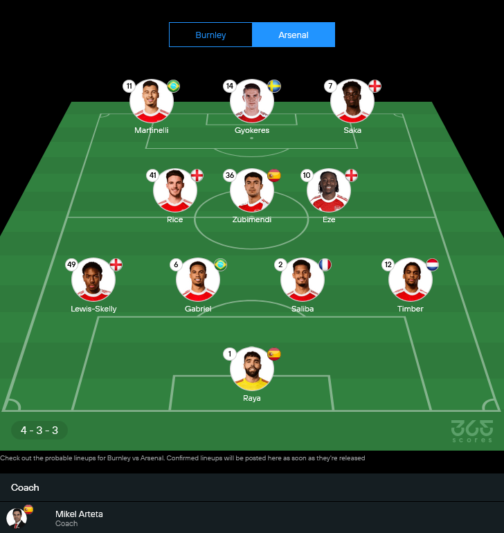 | 11/11/2023 | พรีเมียร์ลีก | อาร์เซนอล 3-1 เบิร์นลี่ย์ |