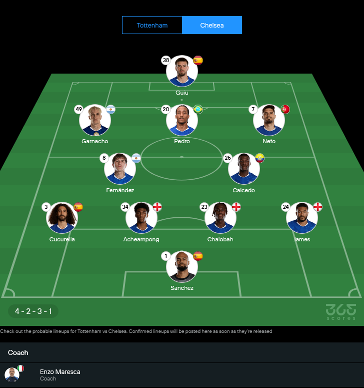 ฝั่งของ “เอนโซ่ มาเรสก้า” ยังไร้เงา โคล พัลเมอร์, เบอนัวต์ บาเดียชิล และ เลวี่ โคลวิลล์ ที่เจ็บต่อเนื่อง แต่ขุมกำลังที่เหลือยังแน่นปึ้ก คาดว่าจะใช้ระบบ 4-2-3-1 เช่นกัน นำโดย เปโดร เนโต้, การ์นาโช่, และ มาร์ก กียู ที่กำลังมั่นใจสุดขีด
