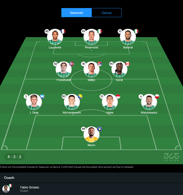 - ผู้เล่นคาดว่าจะลง ซัสซูโอโล่ (4-3-3)