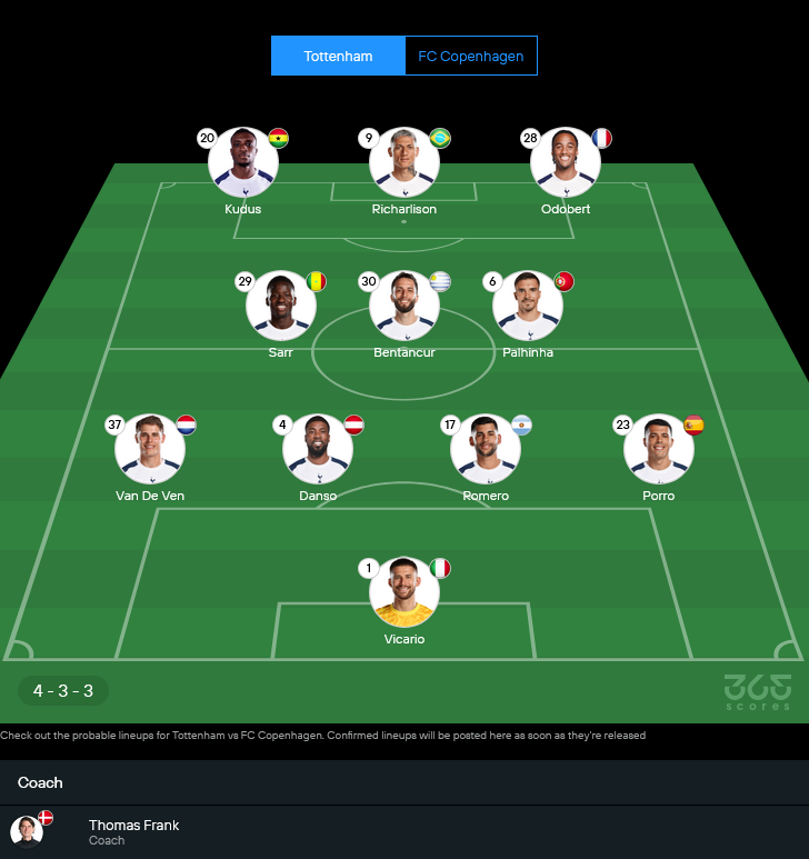 อาการเดี้ยงพรึ่บทั้ง เดยาน คูลูเซฟสกี้, เจมส์ แมดดิสัน, เบน เดวีส์, อาร์ชี่ เกรย์, ราดู ดรากูซิน, โคตะ ทาคาอิ, ลูคัส เบิร์กวัลล์, อีฟส์ บิสซูม่า, โดมินิก โซลันเก้, มาธิส เทล แต่ข่าวดีคือ คริสเตียน โรเมโร่ ฟิตกลับมายืนคุมหลัง ข้างหน้า ริชาร์ลิซอน ยืนหอกเดี่ยว มี โมฮาเหม็ด คูดุส กับ วิลสัน โอโดแบร์ หนุนริมเส้น โค้ชในภาพระบุ โธมัส แฟรงค์ คุมทัพ และระบบที่ใช้จริงจากภาพคือ 4-3-3