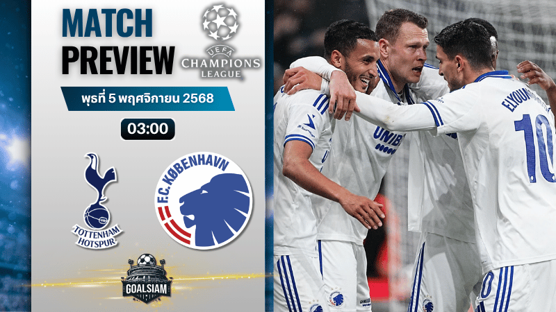GOALSIAM ขอนั่งคุยแบบสายโต๊ะ บอลยุโรปคืนนี้คิวของท็อตแน่ม ฮ็อทสเปอร์ ต้องปลุกไฟในรังตัวเองหลังสะดุดมาหลายนัด เจอกับ เอฟซี โคเปนเฮเก้น ที่ช่วงหลังฟอร์มลีกกำลังไหลลื่น เกมนี้ชี้ชะตาเส้นทางรอบน็อกเอาต์ชัดๆ เราเก็บข้อมูลจากภาพไลน์อัพ ตัวเจ็บ ผลงานล่าสุด และสถิติครบ แล้วค่อยๆ ไล่กันแบบภาษาคนดูบอล มีทิศทาง ทีเด็ดบอล ให้ลุ้นเนียนๆ ตามสไตล์ วิเคราะห์บอล GOALSIAM