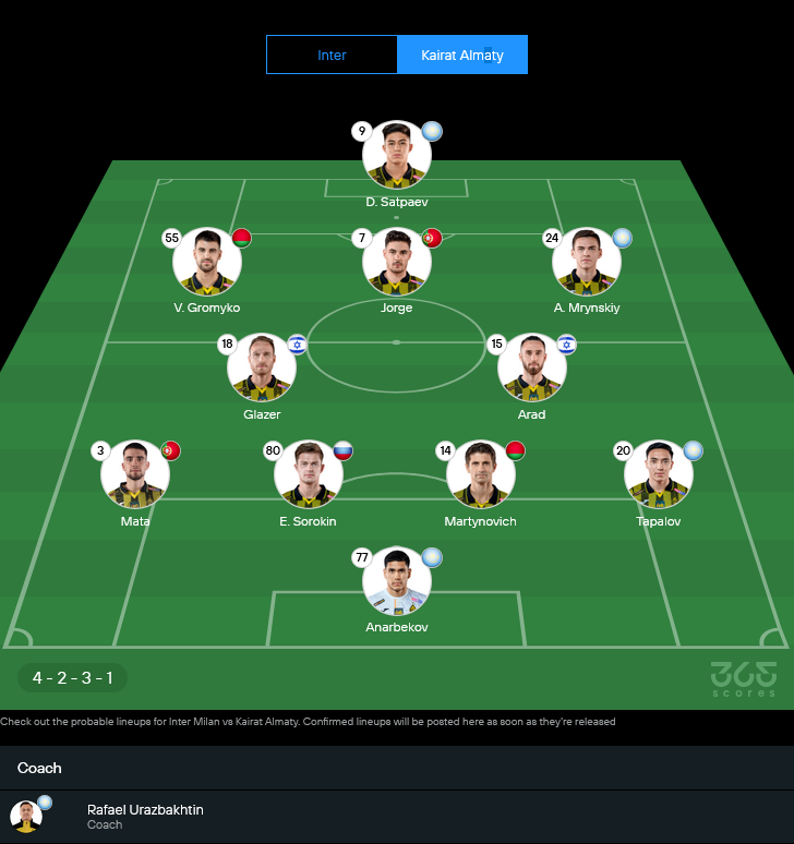 ไครัต อัลมาตี้ เดินทางมาอิตาลีพร้อมโจทย์หนักในการเจอกับทีมที่โหดกว่าทั้งฝีเท้าและแท็กติก แถมยังมีปัญหาตัวใช้งานบางส่วน ไม่ได้ฟูลทีมเต็มร้อย คาดว่ากุนซือ ราฟาเอล อูราซบาคติช จะเน้นจัดระบบ 4-2-3-1 ให้เกมรับแน่นก่อนเป็นอันดับแรก แล้วค่อยหาทางสวนกลับตามช่อง