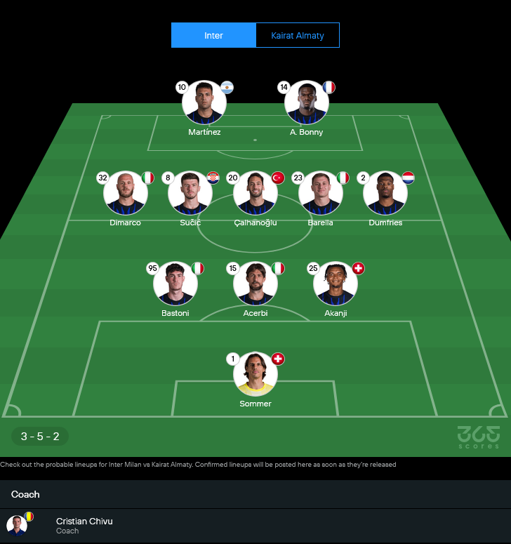 ฝั่งอินเตอร์ในตอนนี้ถือว่าพร้อมรบพอสมควร ไม่มีข่าวตัวหลักเดี้ยงเพิ่มจนต้องปรับแผงแบบยกชุด คาดว่าเทรนเนอร์จะจัดชุดเน้นผลเต็มสูบในระบบ 3-5-2 ตามสไตล์ถนัด เน้นให้วิงแบ็กเติมสูงช่วยเกมรุก กลางสามคนคุมจังหวะ ส่วนคู่หน้าปิดบัญชี
