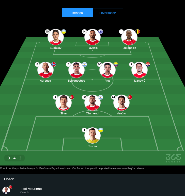 11 ตัวจริงคาดการณ์ เบนฟิก้า (3-4-3) พร้อมเรตคะแนน