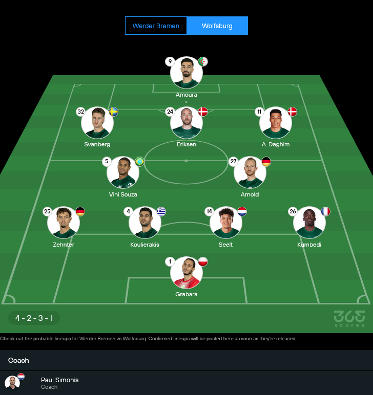 05/11/2023บุนเดสลีกาโวล์ฟสบวร์ก 2-2 แวร์เดอร์ เบรเมน
