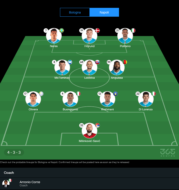 ด้านนาโปลีของ อันโตนิโอ คอนเต้ สภาพทีมไม่สมบูรณ์เท่าไร ตัวเจ็บเพียบทั้ง โรเมลู ลูกากู, อเล็กซ์ เมเร็ต, เควิน เดอ บรอยน์ และ บิลลี่ กิลมัวร์ ยังไม่พร้อม แถมยังต้องเช็กฟิต เลโอนาร์โด้ สปินาซโซล่า อีกหนึ่งตัวเก๋า แต่ข่าวดีคือน่าจะได้สามประสานแนวรุกจัดเต็มตามภาพ 4-3-3 ใช้ โลบอตก้า คุมจังหวะ เกมริมเส้น ฝากหวังที่ โปลิตาโน่ กับ ดาวิด เนเรส ส่วนหน้าเป้าเป็น ราสมุส ฮอยลุนด์ ที่ฟอร์มกำลังห้าว