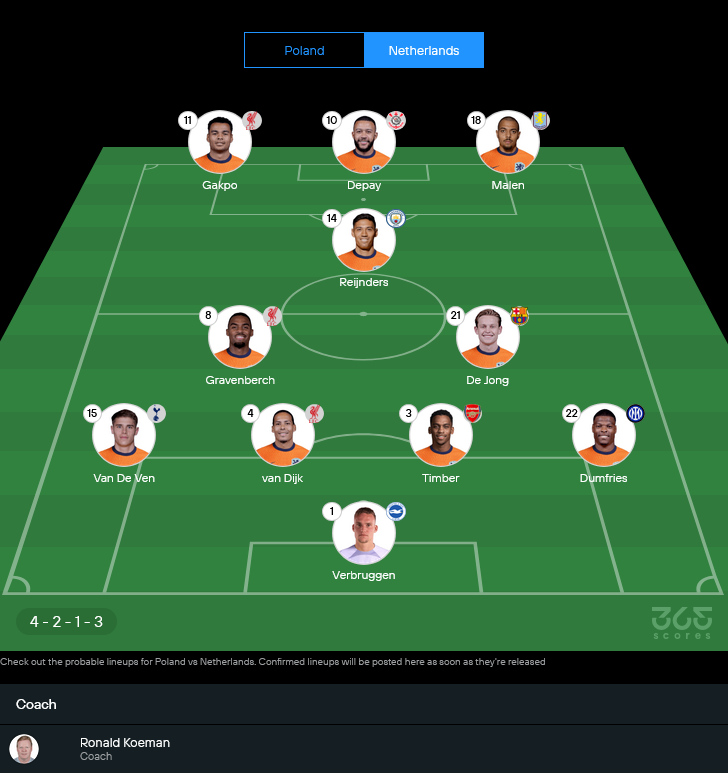 11 ตัวจริงเนเธอร์แลนด์ (คาดการณ์พร้อมเรตคะแนน)