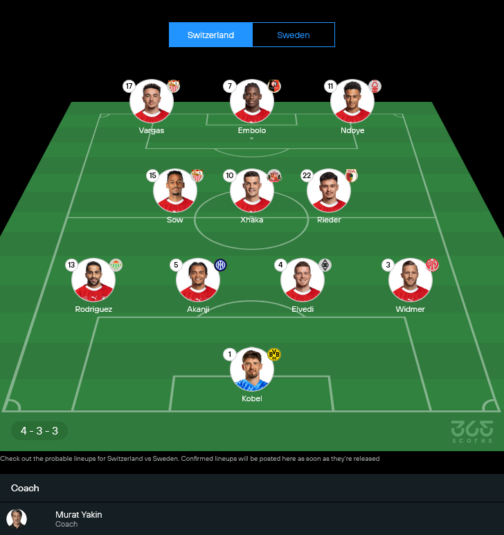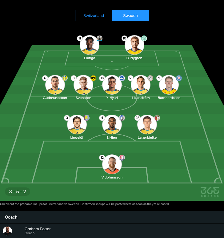 พ็อตเตอร์น่าจะใช้ วิคเตอร์ โยฮันส์สัน ยืนเฝ้าเสา แนวรับสามคนมี ลาเกอร์บีเอลเก้, อิซัค เฮียน และ วิคตอร์ ลินเดอเลิฟ ขณะที่แดนกลางมี ยาสิน อายารี คอยเชื่อมเกมร่วมกับ คาร์ลสเตรอม และ สเวนสสัน ปล่อยให้แอนโธนี อีลังกา กับ เบนจามิน นืยเกรน คอยฉีกไปเล่นงานแนวรับสวิสในพื้นที่ด้านข้าง