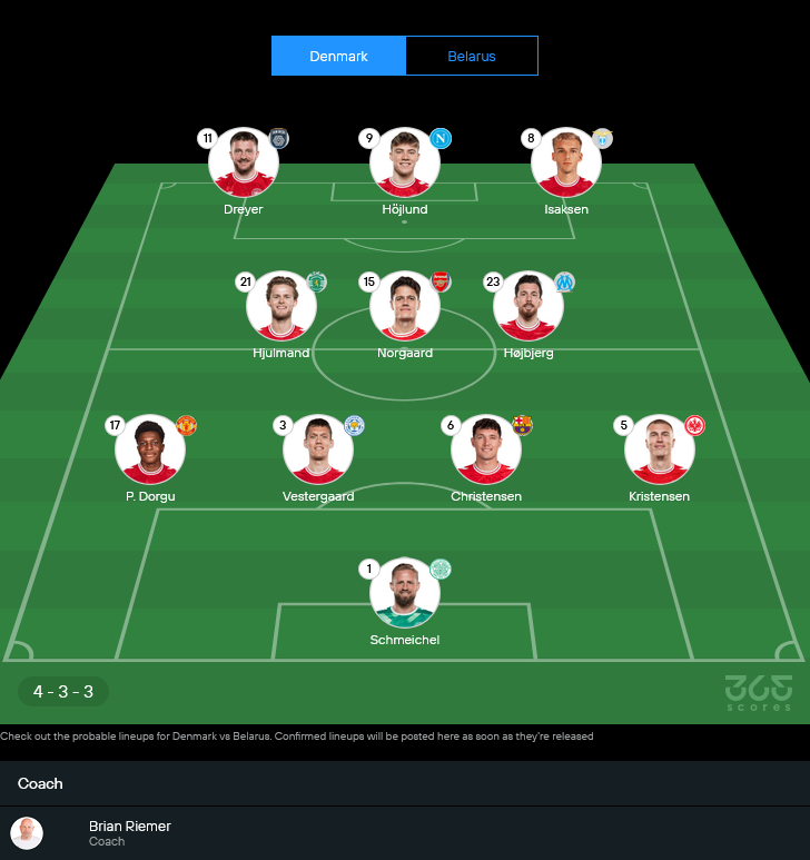 เดนมาร์ก (คาดว่าใช้แผน 4-3-3)