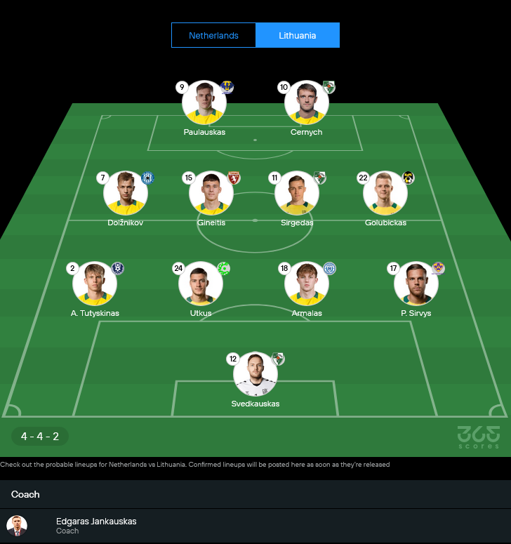 ฝั่งลิธัวเนียของ เอ็ดการาส ยานเคาสคาส ผลงานในกลุ่มอาจไม่สวย แต่สภาพทีมถือว่าโอเค ไม่มีใครเจ็บเพิ่ม มีเพียง เอดวินาส กิร์ดไวน์นิส ที่ติดโทษแบนซึ่งหลุดจากทีมชุดนี้ไปแล้ว จากรูปไลน์อัพล่าสุดคาดว่าจะใช้ระบบ 4-4-2 เน้นเกมรับแน่นแล้วหาจังหวะโต้กลับโดยใช้จังหวะสปีดของตัวริมเส้นอย่าง โดลช์นีคอฟ กับ โกลูบิกคาส ป้อนบอลให้สองหัวหอก เปาลาอุสคาส กับ แชร์นิคห์