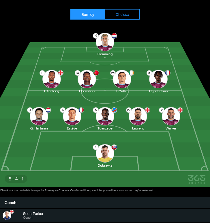 สกอตต์ ปาร์คเกอร์ รู้ดีว่าถ้าเปิดหน้าแลกกับเชลซีมีโอกาสพังยับ เลยเตรียมวางหมากเน้นรัดกุมเป็นหลัก จากภาพไลน์อัพคาดการณ์ เบิร์นลี่ย์ยืนระบบ 5-4-1 แต่ยืดหยุ่นเป็น 4-2-3-1 ตอนสวนกลับ เกมนี้จะขาดตัวหลักหลายราย ทั้ง จอร์แดน เบเยอร์, เซกิ แอมดูนี่, คอเนอร์ โรเบิร์ตส์ และ เอน็อค อักเยยี ที่เดี้ยงยาว บวกกับ กีลินด์ชี่ ฮาร์ตแมน มีอาการป่วย ทำให้ตัวเลือกแนวรับหดไปพอสมควร