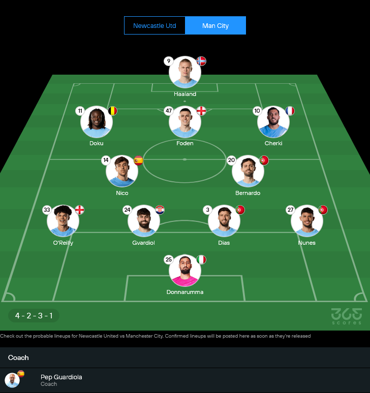 ด้านทีมเยือนของ เป๊ป กวาร์ดิโอล่า ตอนนี้เริ่มได้ขุมกำลังกลับมาค่อนข้างครบ เหลือแค่ มาเตโอ โควาชิช ที่ยังเจ็บ ส่วน โรดรี้ อยู่ในกลุ่มต้องเช็กความฟิตแต่มีชื่อในทีมแน่นอน ที่เหลือพร้อมลุย นำโดย เออร์ลิ่ง ฮาลันด์ ดาวยิงเบอร์หนึ่งของลีกที่เครื่องร้อนจัด เกมรุกริมเส้นเป็นหน้าที่ของ เฌเรมี่ โดกู กับ รายาน แชร์กี้ ส่วนกลางรุกใช้ ฟิล โฟเด้น รับบทจอมทัพ